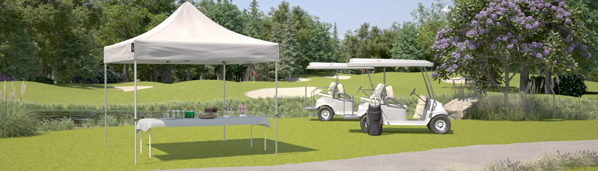 Ebenfalls wurden unsere Faltpavillons bei dem Golf-Event unter anderem als Wetterschutz und Überdachung für die Catering-Bereiche genutzt. Diese befanden sich an mehreren Stellen über den gesamten Golfplatz verteilt und konnten bei Bedarf von den Golfern angesteuert werden.