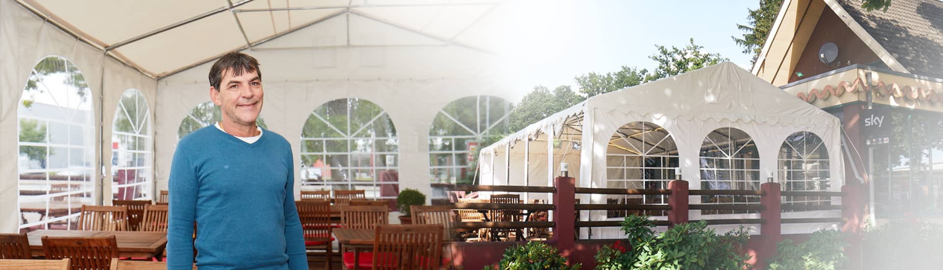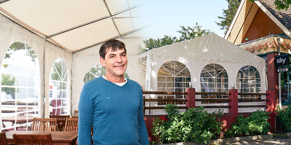 Die Leute kommen hierher und setzen sich direkt nach draußen. Erst wird es hier voll und dann setzen sich die Gäste nach drinnen. Hier im Zelt ist mehr Luft und natürlich spielen auch die Medien eine Rolle. Dort wird gesagt, dass es luftig sein muss und die Leute merken sich das. Sie haben natürlich etwas Angst. Dadurch ist die Partyzelt-Lösung sehr gut akzeptiert. Die Leute schauen auch gerne aus den Fenstern des Zeltes hinaus und beobachten, was außerhalb des Zeltes so geschieht. Deshalb haben wir uns auch für ein Partyzelt mit Fenstern entschieden. Ansonsten wäre es auch zu dunkel. So ist es sehr lichtdurchflutet.