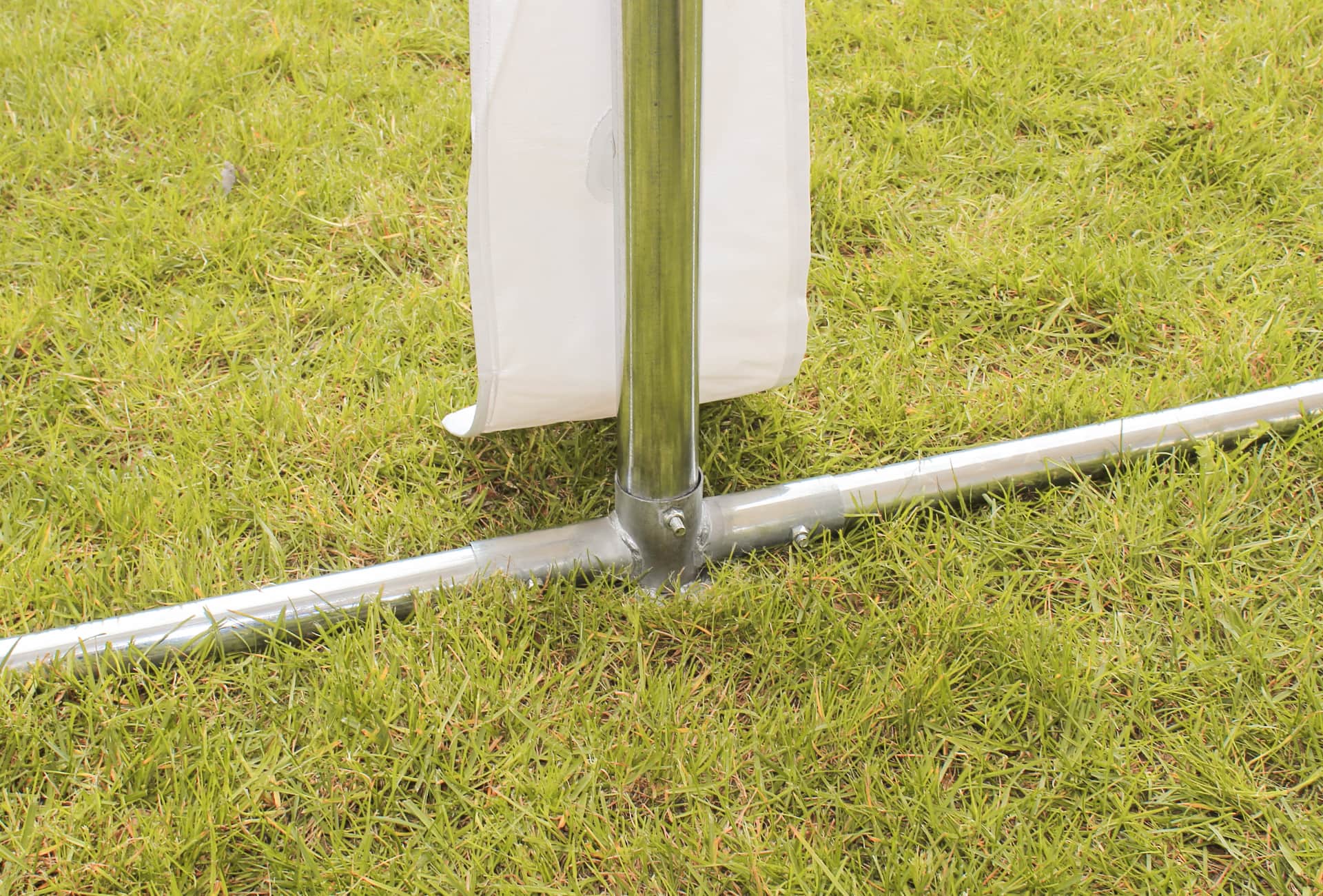 Ein Bodenrahmen stabilisiert die gesamte Konstruktion, wirkt statischen und dynamischen Belastungen entgegen wie z.B. bei Sturm und verhindert dadurch Verformungen der Konstruktion Ihres Partyzeltes.
