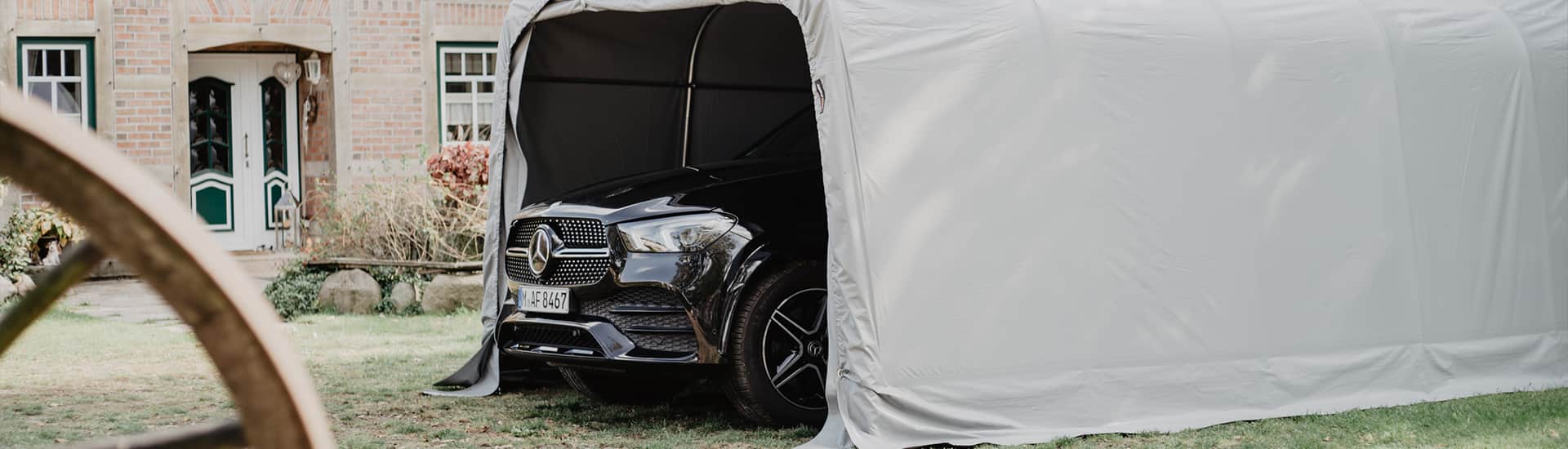 Zeltgaragen sind eine günstige und schnell aufbaubare Alternative zu Carports und Garagen. Man kann sie auch als “mobile Garage” für Fahrzeuge bezeichnen. Unsere Garagenzelte sind wasserdicht, standsicher, robust, bieten einen UV-Schutz 50+ und unsere PVC-Modelle sind zudem für den Ganzjahreseinsatz geeignet.